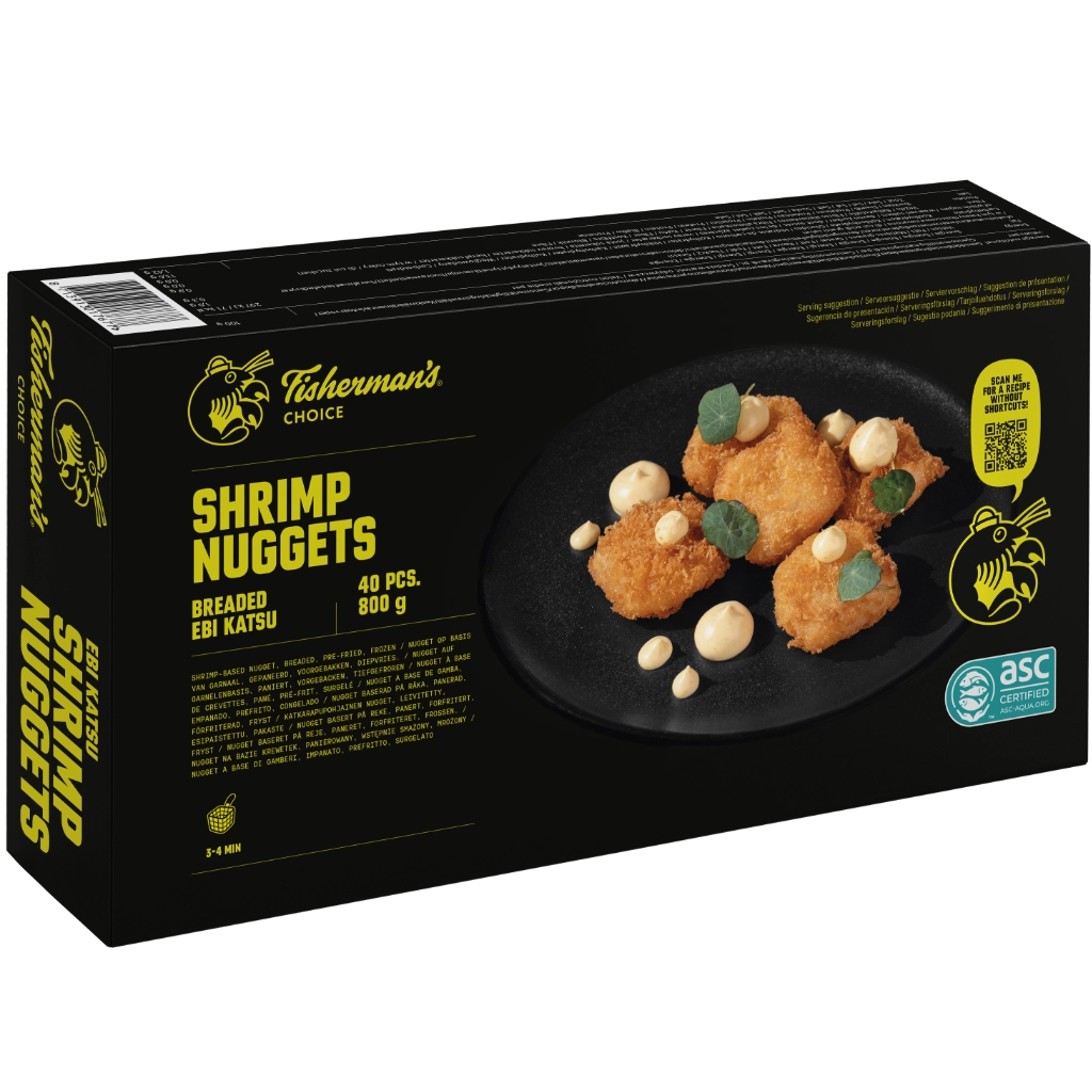 Nugget op basis van garnaal, gepaneerd, voorgebakken, diepvries.