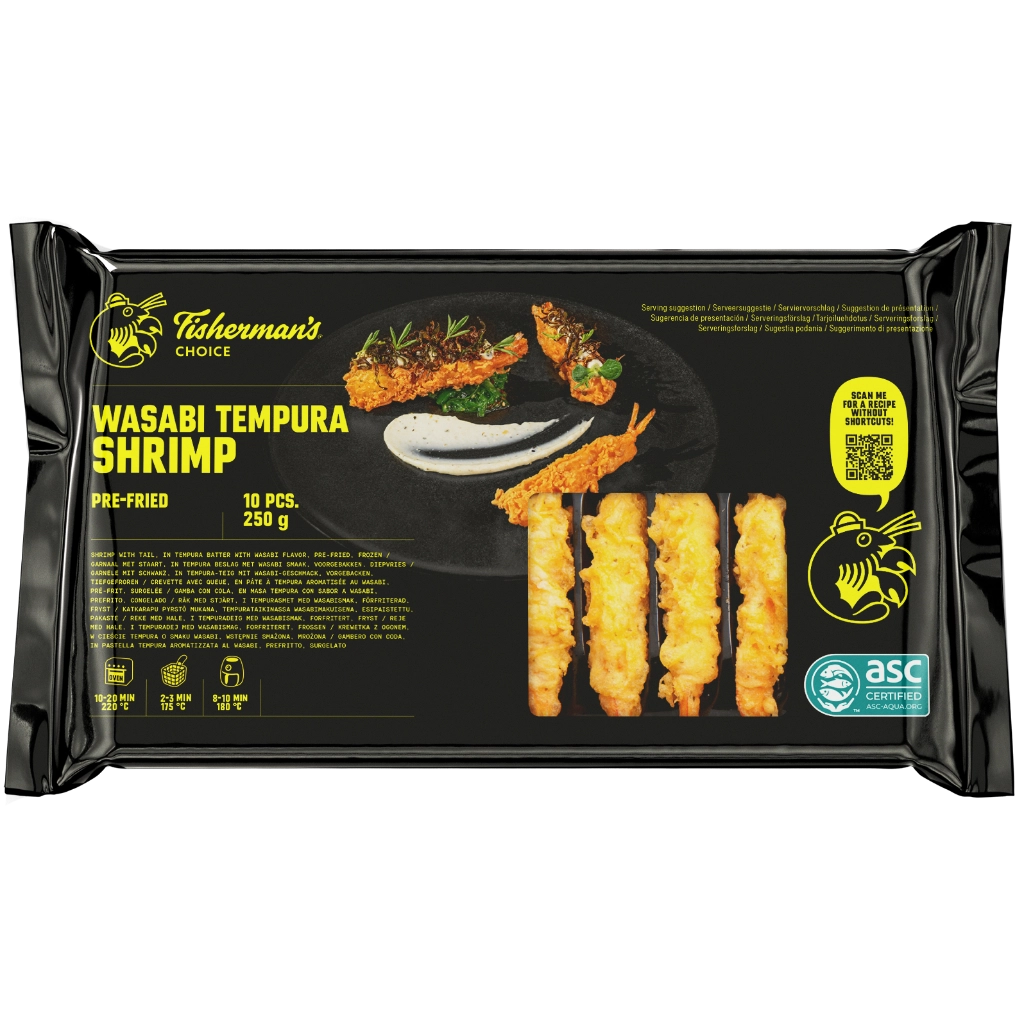 Frituur: De bevroren Fisherman's Choice Wasabi Tempura Shrimp ASC garnalen bij 175°C ca. 2.15-2.30 minuten frituren. Oven: verwarm de oven voor op 220°C en leg de bevroren Fisherman's Choice Wasabi Tempura Shrimp ASC garnalen voor 10-12 minuten in het midden van de oven. Regelmatig draaien. Airfryer: 8 tot 10 minuten bij 180°C.